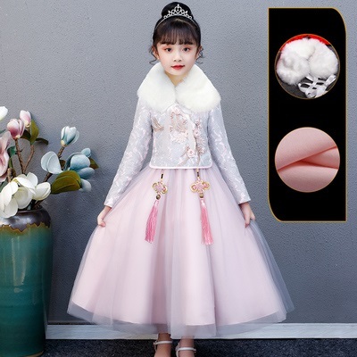 チャイナドレス 子供用 キッズ 女の子 プリンセス 衣装 お姫様 お嬢様 花柄 刺繍 レース ビジュー 長袖 チュール ロング Aライン カチューシャ ファー 切り替え ファスナー タッセル ふんわり かわいい キュート ラブリー 華やか 存在感 110cm 120cm 130cm 140cm 150cm 160cm