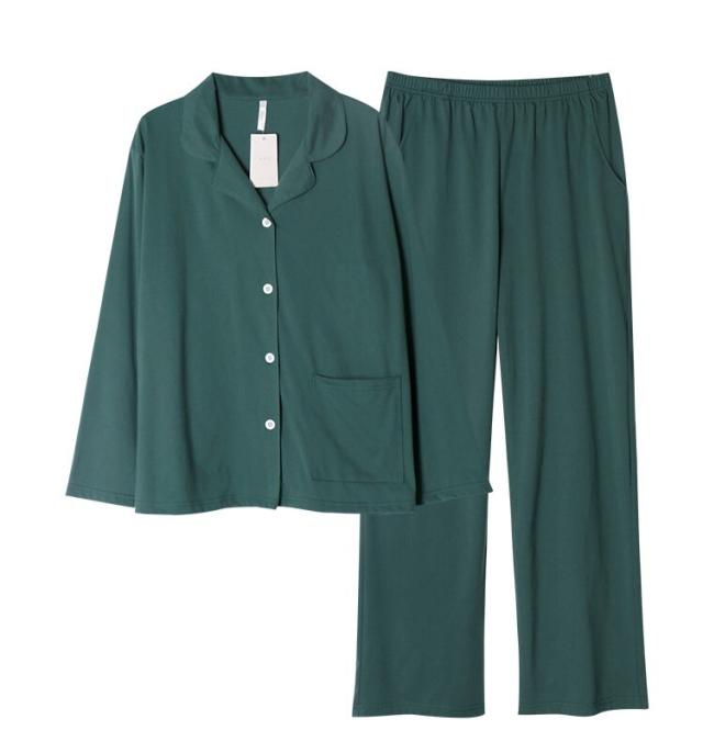 レディース パジャマ 長袖 パンツ 無地 開襟 前開き ウエストゴム ポケット付き ルームウェア ナイトウェア 部屋着 寝間着 上下 2点セット ツーピース セットアップ ゆったり 楽ちん シンプル ナチュラル 大人 女子 春 秋 お泊まり 旅行 おうち時間 M L XL 2XL グリーン