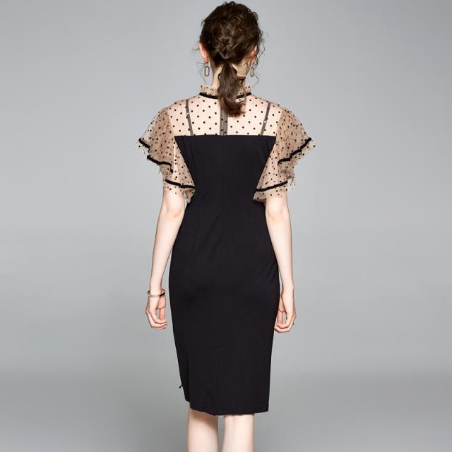 ドレス ワンピース ひざ丈 半袖 フレアスリーブ シースルー ドット リボン ハイネック Iライン 細身 ワンピドレス レース 刺繍 透け感 切り替えデザイン 大人 女子 かわいい シンプル 上品 エレガント 春 夏 小さい 大きいサイズ キャバ パーティー お呼ばれ S M L XL 2XL 黒