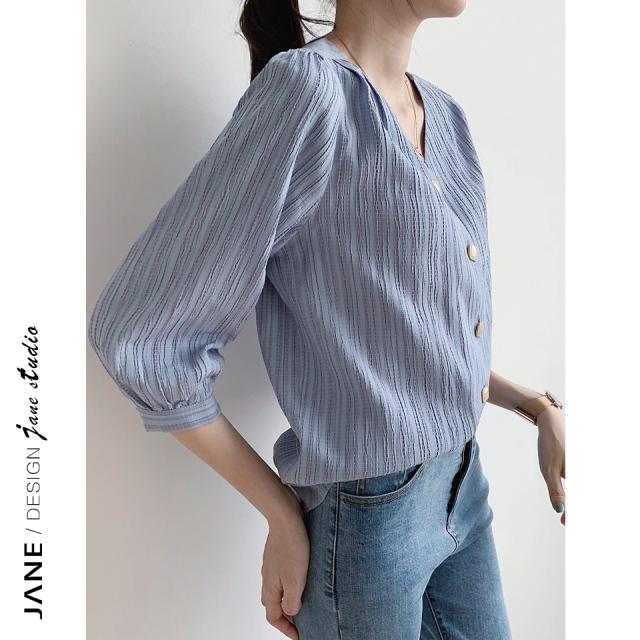?Xネック七分袖ブラウス トップス ブラウス 袖あり 7分袖 七分袖 Vネック 前開き かわいい 大人可愛い きれいめ シンプル カジュアル 大人 おしゃれ お洒落 大人可愛い 大人女子 こなれ感 ラブリー キュート ガーリー 個性的 クール 主役級 存在感 無地 0 春 夏 秋 10代 20代 30代 レディース OL 学生 通学 デート お出かけ 女子会 休日 着回し 普段使い 韓国 韓国系 サイズ S M L 色展開 青 ブルー
