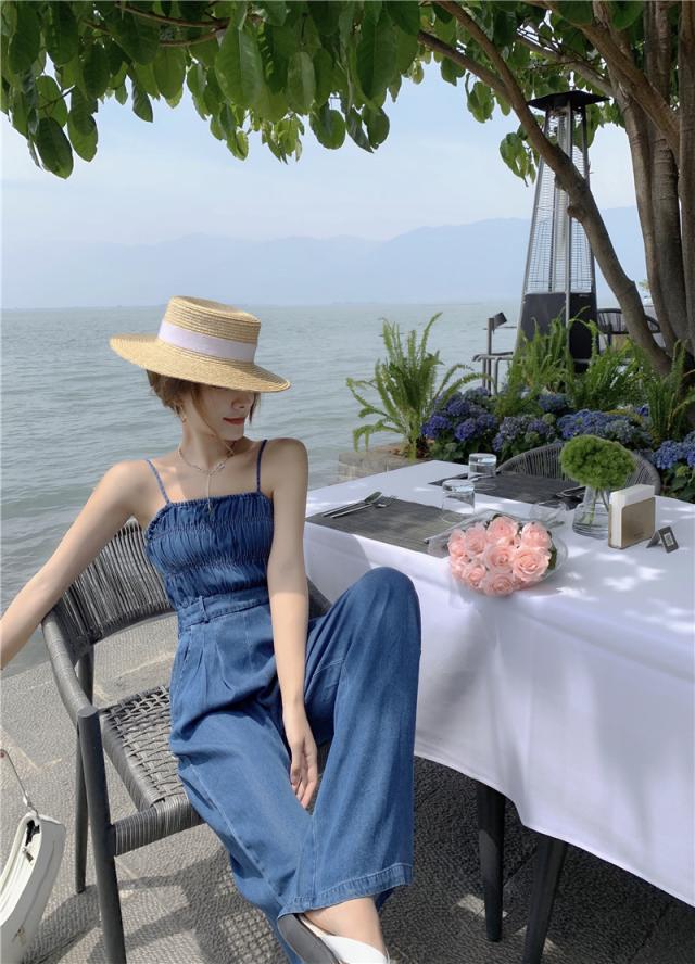 サロペット パンツ レディース 夏 ハイウエスト ワイド キャミソール ポケット付き デニム ギャザー オールインワン オーバーオール ジャンプスーツ 大人 女子 かわいい おしゃれ カジュアルコーデ シンプル 重ね着 レイヤードスタイル 海 ビーチ リゾート 旅行 着回し 休日