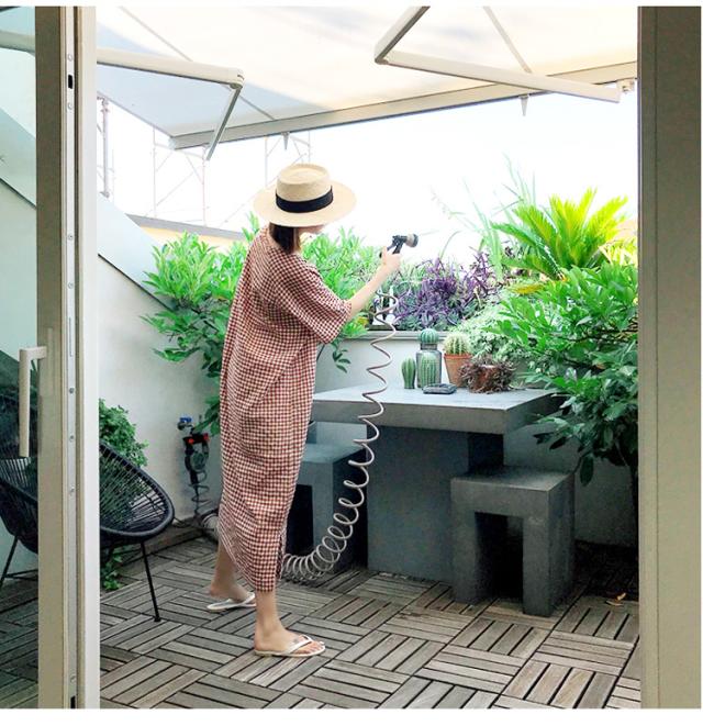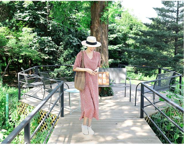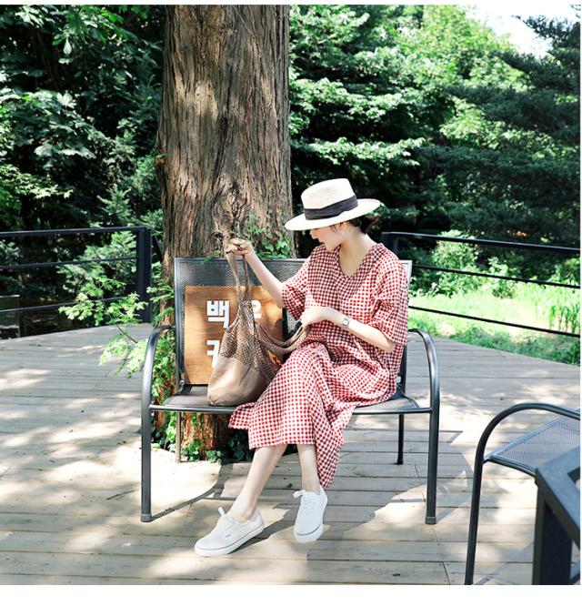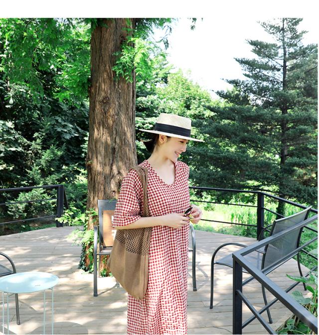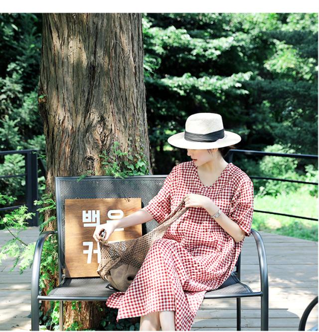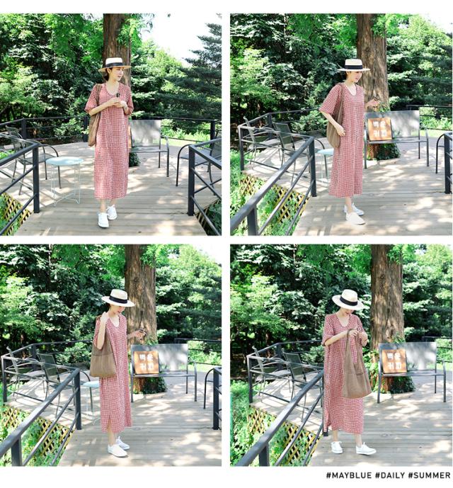 ギンガムチェック ワンピース レディース カジュアル ロング丈 袖あり 半袖 ラウンドネック サイドスリット 綿 麻 リネン 大人 可愛い きれいめ シンプル おしゃれ レトロ 女子力 こなれ感 ラブリー キュート ガーリー ナチュラル 夏 お出かけ 休日 デート ゆったり サイズ