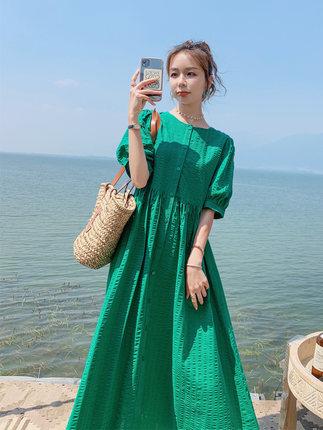 パフスリーブロングワンピース ワンピース フレアワンピース ロング ロング丈 袖あり 半袖 パフスリーブ スクエアネック フレア 前開き かわいい 大人可愛い シンプル カジュアル 大人 おしゃれ お洒落 レトロ 大人可愛い 大人女子 こなれ感 ラブリー キュート ガーリー 個性的 主役級 存在感 無地 春 夏 10代 20代 30代 レディース 学生 通学 デート お出かけ 女子会 休日 着回し 普段使い 重ね着 サイズ S M L XL 色展開 緑 グリーン