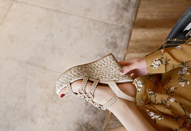涼しげなジュートタイプのウエッジソールで、夏らしい軽やかさと歩きやすさを併わせもつサンダル。