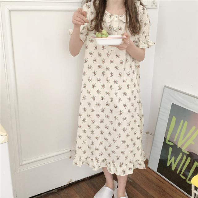 花柄パジャマワンピース ルームウェア パジャマ 部屋着 寝巻き ナイトウェア ネグリジェ ミモレ ミモレ丈 ロング ロング丈 袖あり 半袖 ラウンドネック 襟付き フリル 綿 かわいい 大人可愛い シンプル カジュアル おしゃれ お洒落 大人可愛い 大人女子 こなれ感 ラフ ラブリ