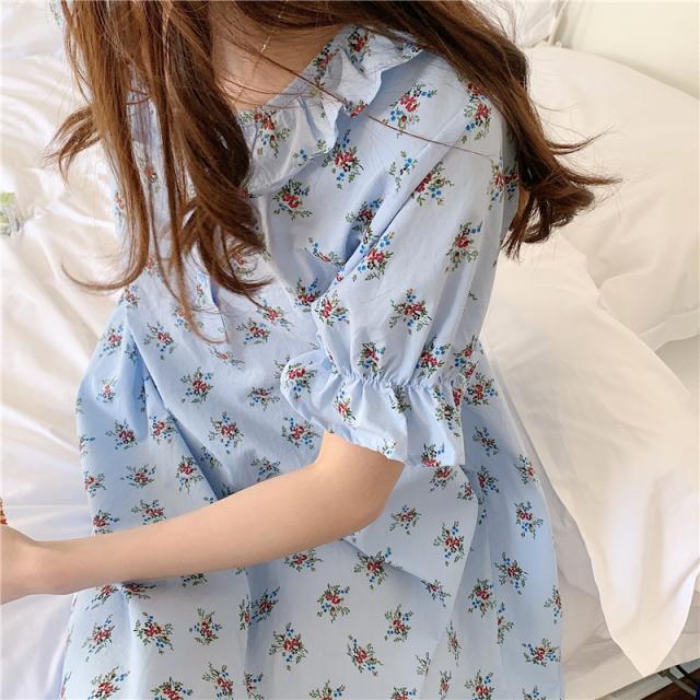 花柄パジャマワンピース ルームウェア パジャマ 部屋着 寝巻き ナイトウェア ネグリジェ ミモレ ミモレ丈 ロング ロング丈 袖あり 半袖 ラウンドネック 襟付き フリル 綿 かわいい 大人可愛い シンプル カジュアル おしゃれ お洒落 大人可愛い 大人女子 こなれ感 ラフ ラブリー キュート ガーリー 主役級 柄 花柄 小花柄 フラワー 春 夏 10代 20代 30代 レディース 女子会 お泊まり 休日 着回し 普段使い 重ね着 韓国 韓国系 楽ちん 色展開 青 ブルー アプリコット