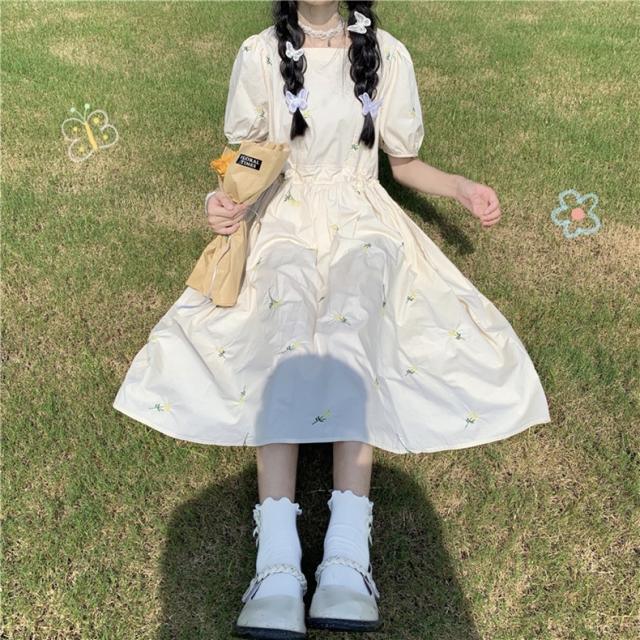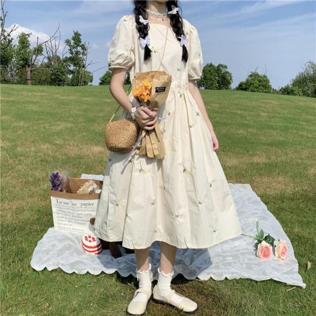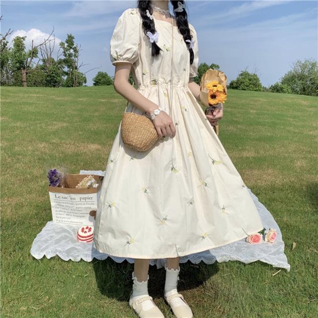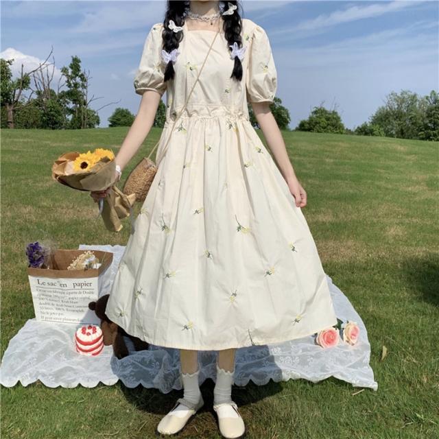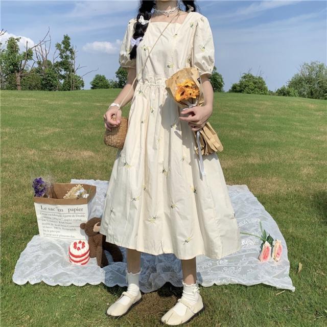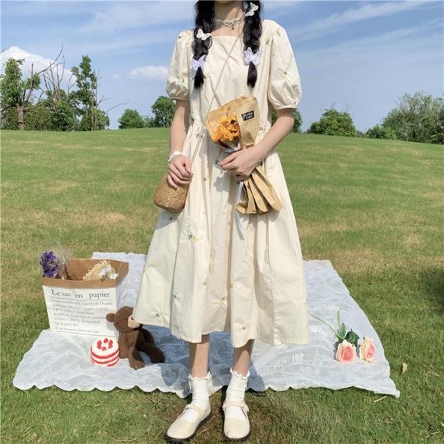 ワンピース レディース カジュアル フレア ミモレ丈 袖あり 半袖 パフスリーブ スクエアネック Aライン デイジー刺繍 綿 大人 可愛い きれいめ シンプル おしゃれ レトロ 女子力 ラブリー キュート ふんわり 春 夏 通学 学生 休日 お出かけ dデート リゾート 旅行