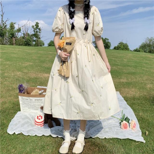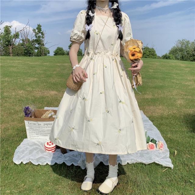 デイジー刺?ワンピース ワンピース フレアワンピース ミモレ ミモレ丈 袖あり 半袖 パフスリーブ スクエアネック フレア Aライン 刺繍 綿 ポリエステル かわいい 大人可愛い きれいめ シンプル カジュアル 大人 おしゃれ お洒落 レトロ 大人可愛い 大人女子 ラブリー キュート ガーリー 主役級 存在感 無地 フラワー 春 夏 10代 20代 30代 レディース 学生 通学 デート お出かけ 公園デビュー 女子会 休日 着回し 普段使い 韓国 韓国系 サイズ S M L 色展開 アプリコット