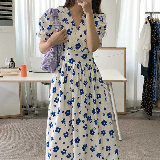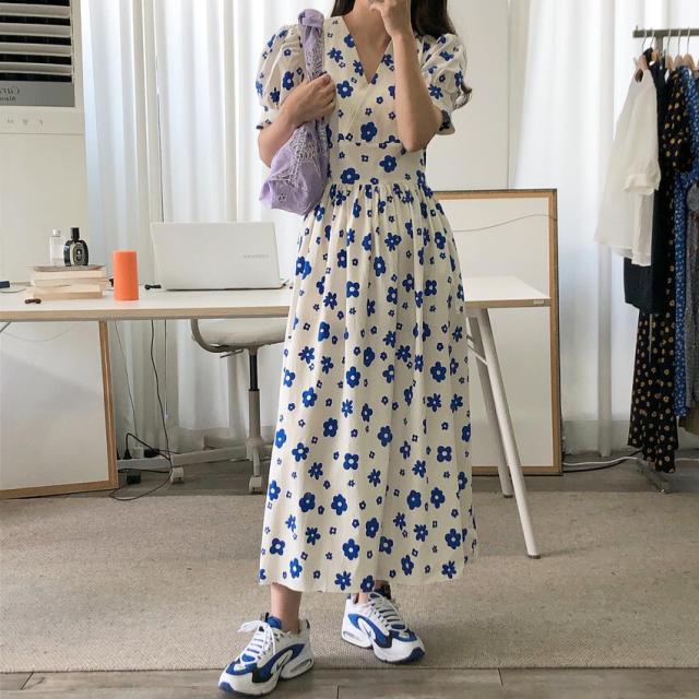 ロング ワンピース レディース カジュアル フレア マキシ丈 花柄 袖あり 半袖 パフスリーブ Vネック ハイウエスト 綿 大人 可愛い シンプル おしゃれ レトロ 女子力 こなれ感 ラブリー キュート ギャザー ボリューム スタイルアップ 学生 通学 休日 お出かけ デート 春 夏