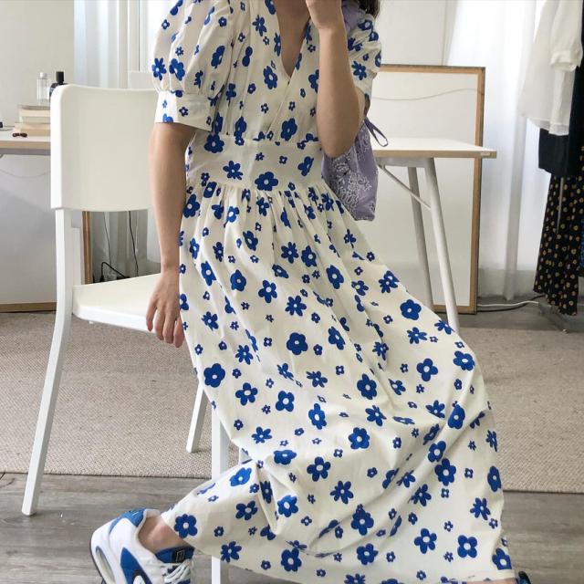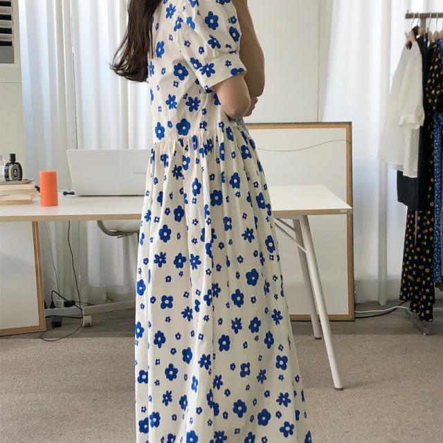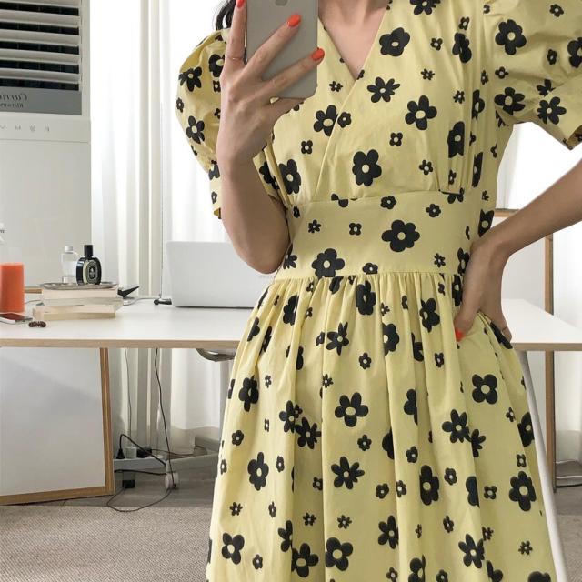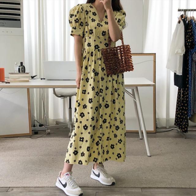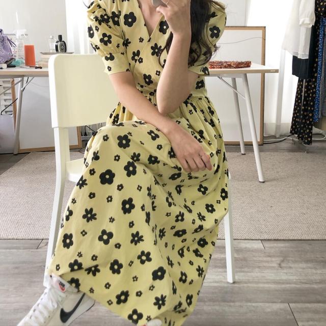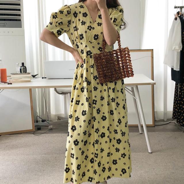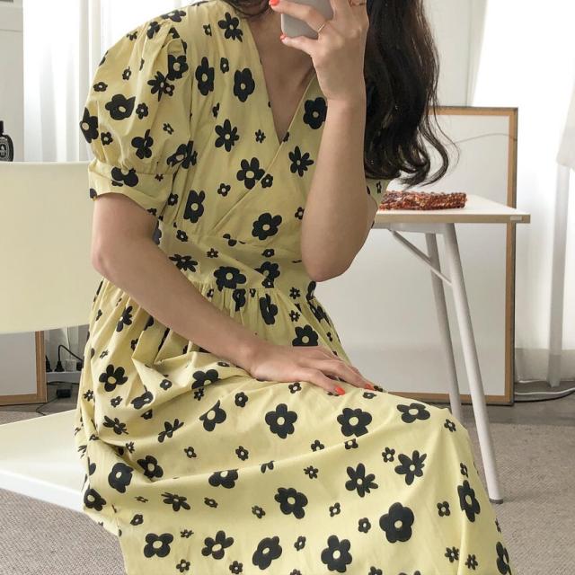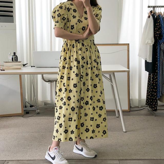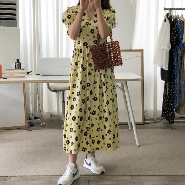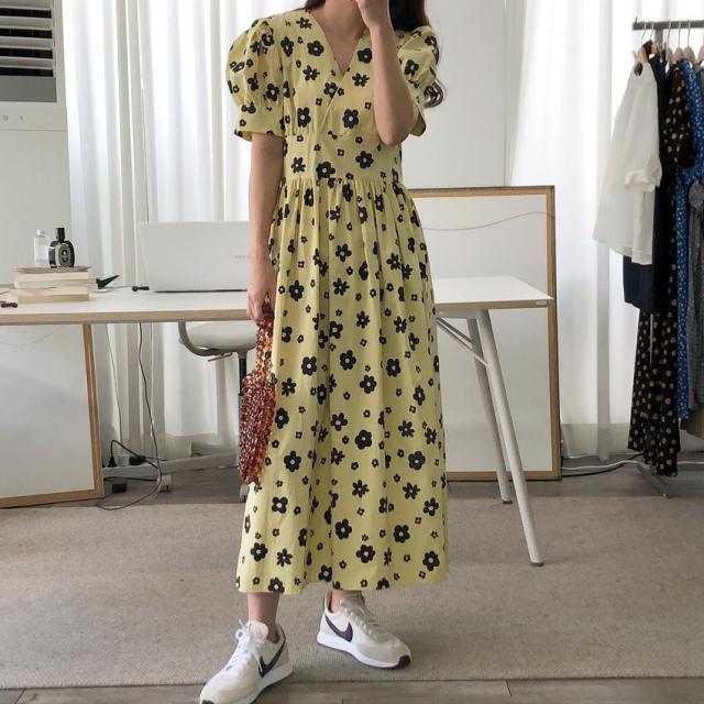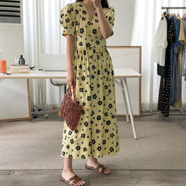 花柄ロングワンピース ワンピース フレアワンピース ロング ロング丈 マキシ マキシ丈 袖あり 半袖 パフスリーブ Vネック フレア ハイウエスト 綿 ポリエステル かわいい 大人可愛い シンプル カジュアル おしゃれ お洒落 レトロ 大人可愛い 大人女子 こなれ感 ラブリー キュート ガーリー 個性的 主役級 存在感 柄 花柄 フラワー 春 夏 10代 20代 30代 レディース 学生 通学 デート お出かけ 公園デビュー 女子会 休日 着回し 普段使い 韓国 韓国系 色展開 白 ホワイト イエロー
