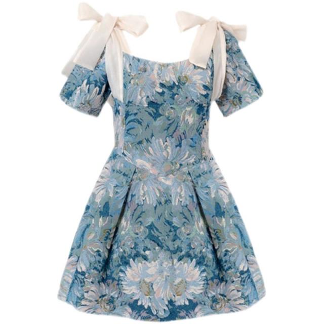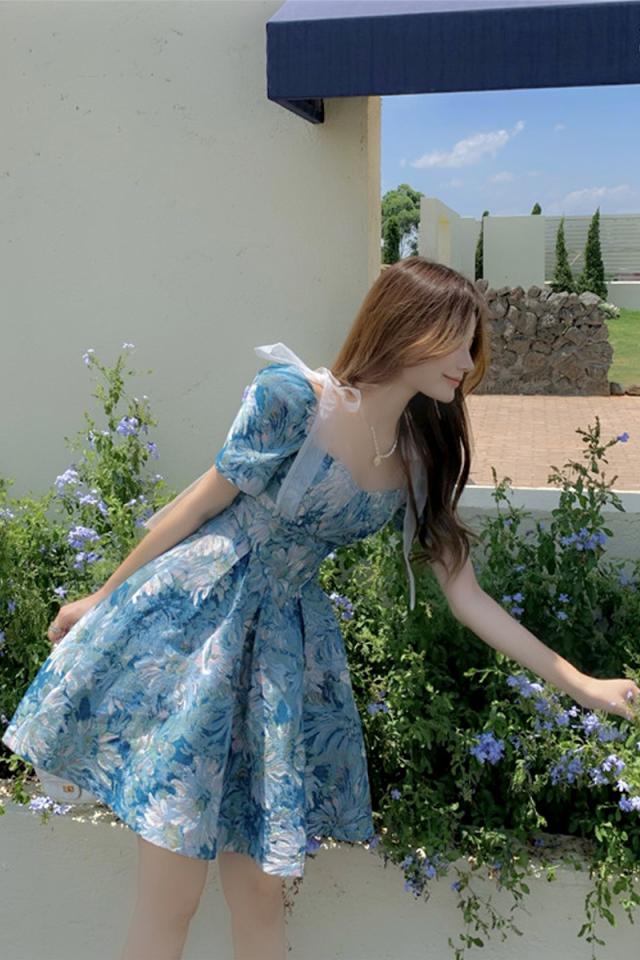 花柄チュールリボンワンピース ワンピース フレアワンピース ショート ショート丈 膝上 袖あり 半袖 パフスリーブ スクエアネック フレア Aライン リボン ハイウエスト 透け感 かわいい 大人可愛い きれいめ シンプル 大人 上品 おしゃれ お洒落 レトロ 大人可愛い 大人女子 こなれ感 ラブリー キュート ガーリー 主役級 柄 花柄 フラワー 春 夏 10代 20代 30代 レディース 学生 通学 デート お出かけ 公園デビュー 女子会 休日 着回し 普段使い 韓国 韓国系 モテ S M L 青