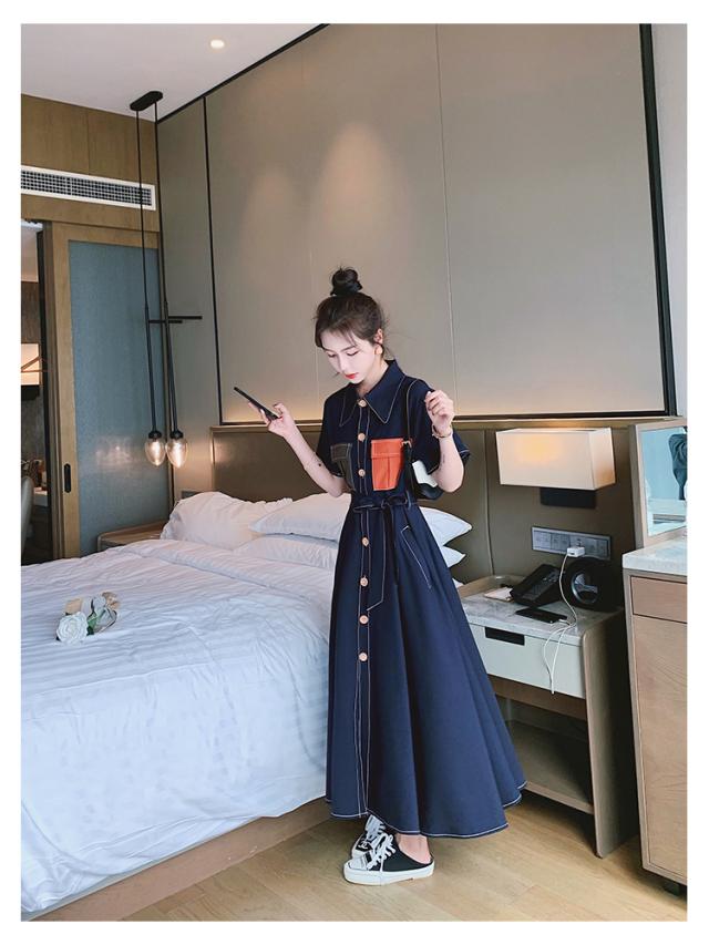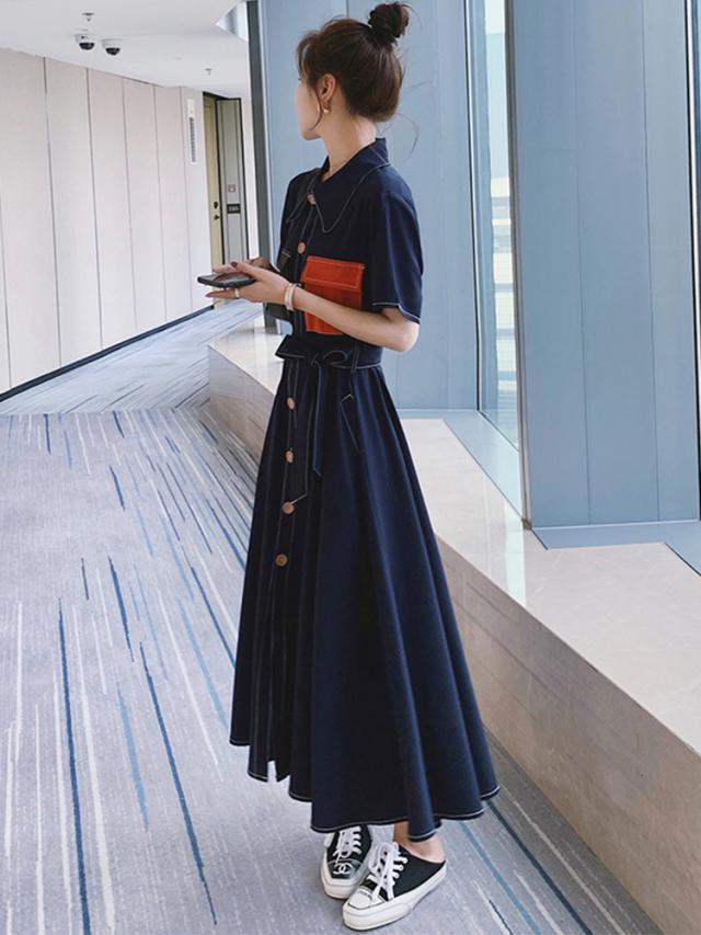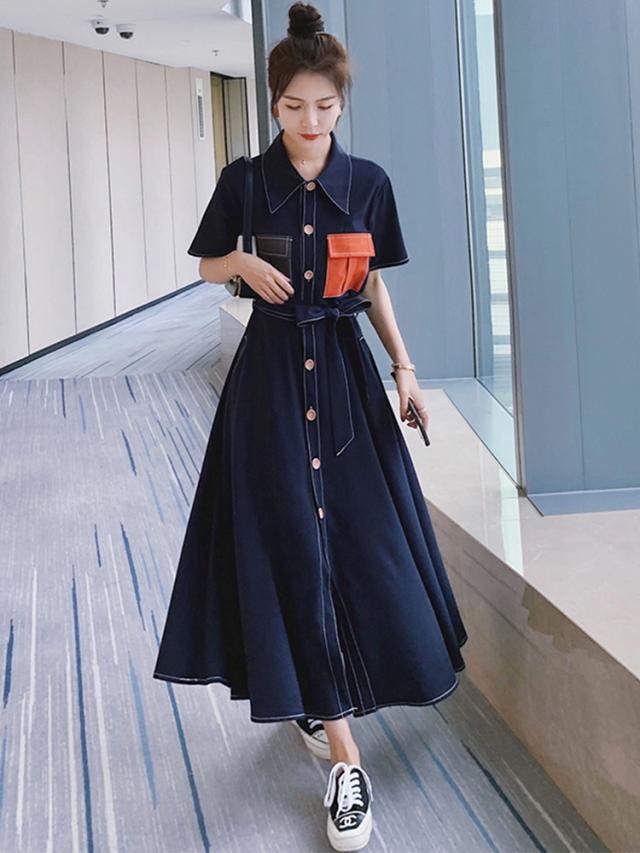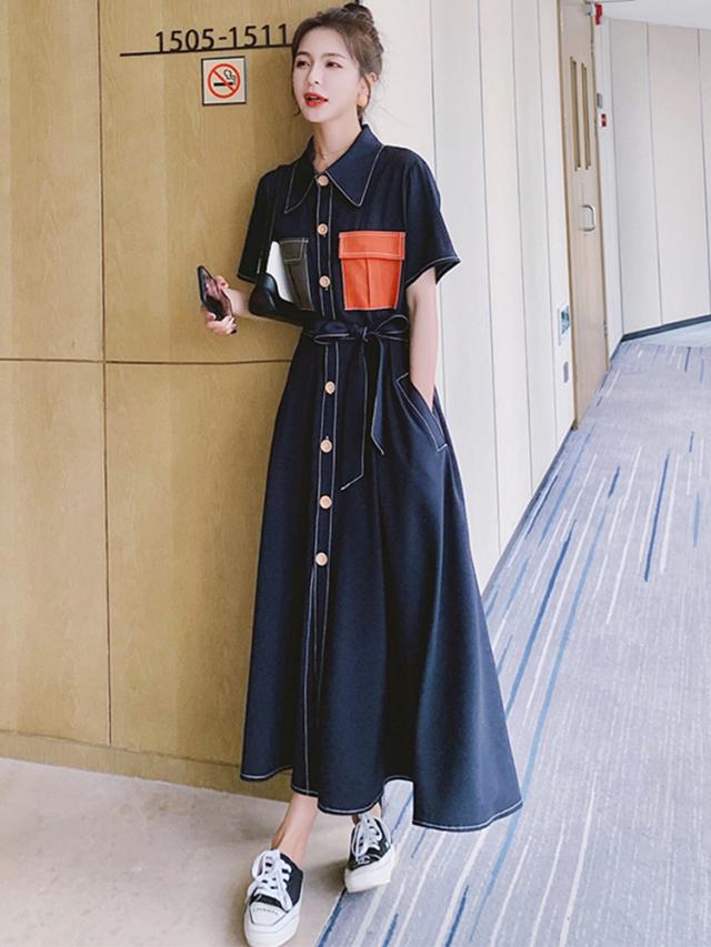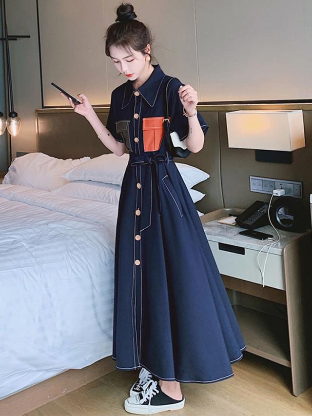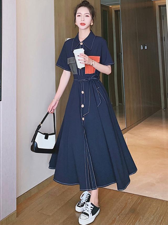 ステッチシャツワンピース ワンピース シャツワンピース ロング ロング丈 袖あり 半袖 襟付き フレア Aライン ウエストマーク ウエストリボン 前開き かわいい 大人可愛い きれいめ シンプル カジュアル おしゃれ お洒落 レトロ 大人可愛い 大人女子 こなれ感 ラフ ラブリー キュート ガーリー 個性的 主役級 存在感 無地 春 秋 10代 20代 30代 レディース 学生 通学 デート お出かけ 女子会 休日 着回し 普段使い 重ね着 韓国 韓国系 サイズ S M L XL 色展開 ネイビー
