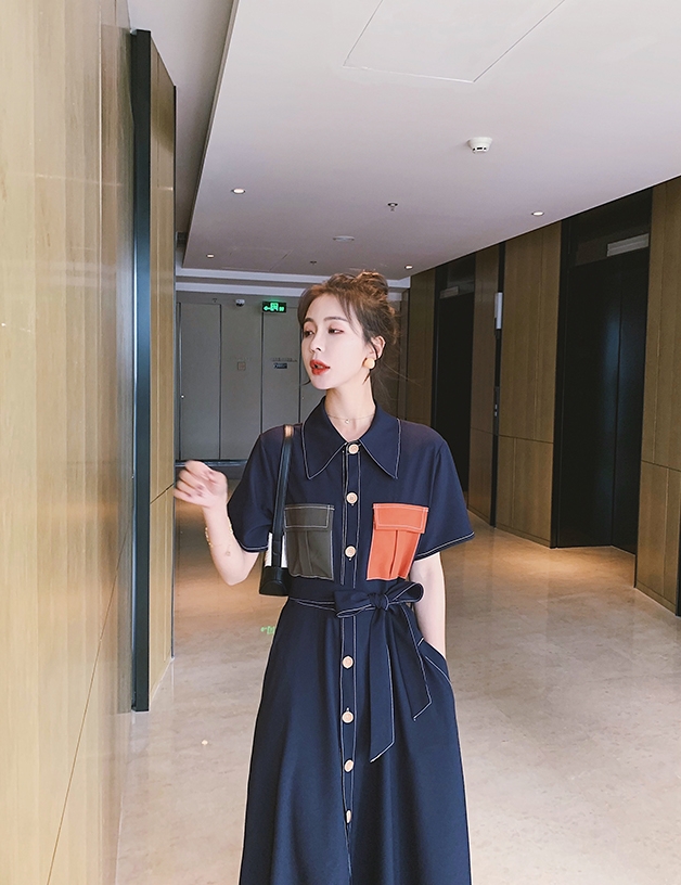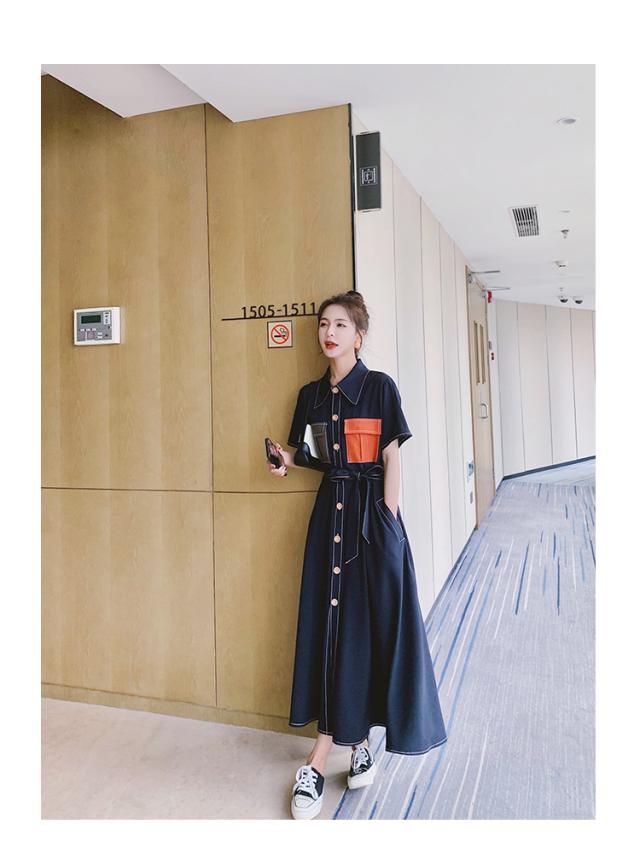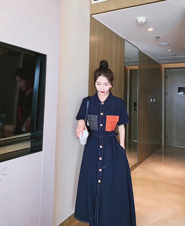 ステッチ シャツ ワンピース レディース カジュアル ロング丈 袖あり 半袖 襟付き フレア Aライン ウエストリボン 前開き 大人 可愛い きれいめ シンプル おしゃれ レトロ 女子力 こなれ感 ラフ ラブリー 胸ポケット 個性的 夏 通学 学生 休日 お出かけ 脚長効果