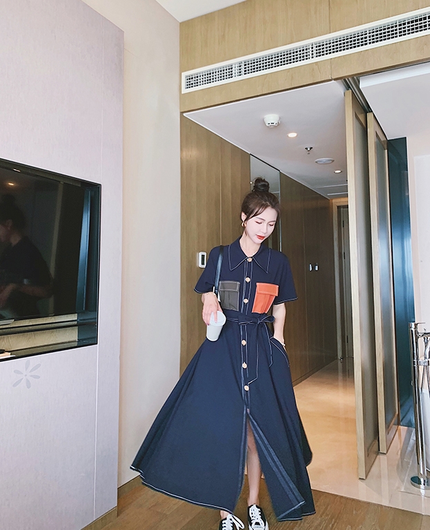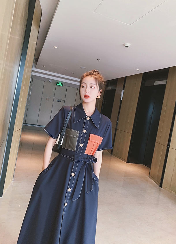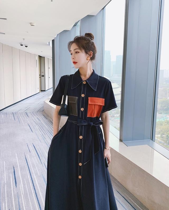 胸元のポケットが個性的で可愛いロング丈ステッチシャツワンピース。
