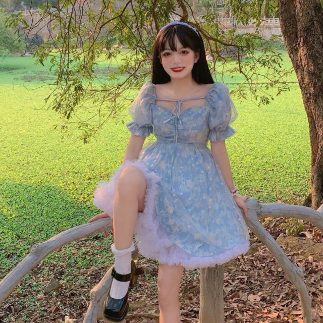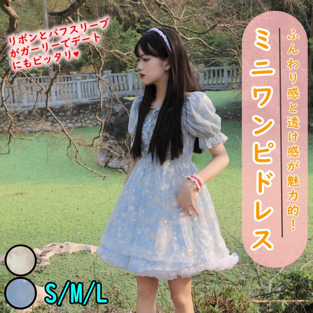 シースルーワンピース ワンピース フレアワンピース ワンピドレス ミニ ミニ丈 ショート ショート丈 袖あり 半袖 パフスリーブ スクエアネック フレア Aライン チュール リボン 透け感 シースルー かわいい 大人可愛い きれいめ シンプル 大人 上品 おしゃれ お洒落 大人可愛い 大人女子 こなれ感 ラブリー キュート ガーリー 主役級 柄 春 夏 10代 20代 30代 レディース デート お出かけ 女子会 休日 着回し 普段使い 韓国 韓国系 サイズ M L XL 色展開 青 ブルー ピンク