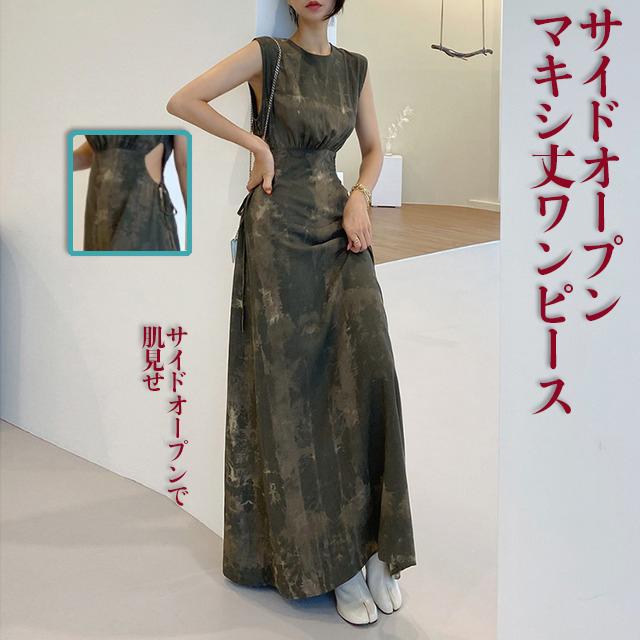 ワンピース レディース タイダイ柄 ドレス ロング マキシ ノースリーブ ラウンドネック 切り替えデザイン ウエストマーク ウエストリボン サイドコンシャス かわいい 大人 きれいめ シンプル カジュアル 上品 お出かけ デート ランチ ディナー 女子会 リゾート 海 プール 夏