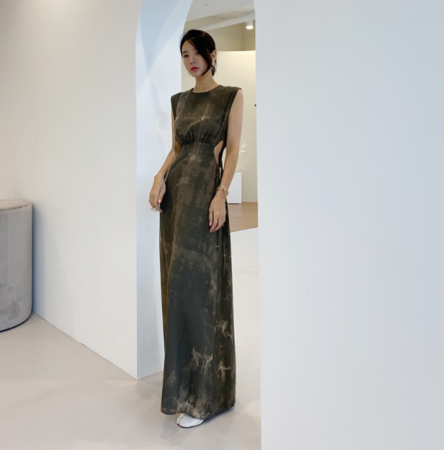 ワンピース ロングワンピース 膝下 マキシ マキシ丈 袖なし ノースリーブ ランタンスリーブ ラウンドネック タイト ストレート 切り替えデザイン ウエストマーク ウエストリボン サイドシャン サイドコンシャス かわいい 大人可愛い きれいめ シンプル カジュアル 大人 上品 おしゃれ お洒落 こなれ感 タイダイ柄 マーブル柄 大理石柄 春 夏 20代 30代 レディース ママ マタニティ お出かけ 女子会 休日 リゾート 旅行 海 プール 韓国 オルチャン 美脚 脚長 ワンサイズ ブラウン