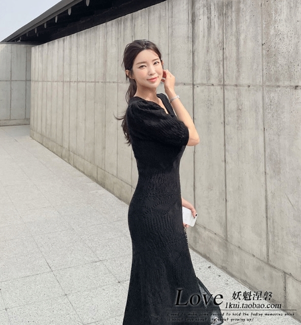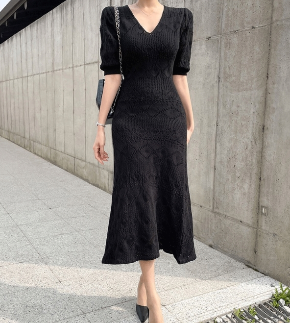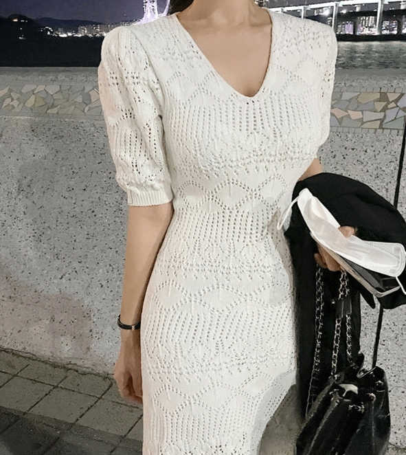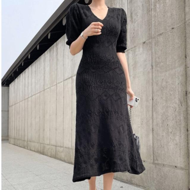 ニットワンピース ミモレ丈 クロシェ編 五分袖 Vネック パフスリーブ 透け感 春 夏 秋 ワンピドレス Aライン タイト 細身 レース ペチワンピース付 大人 女子 かわいい 清楚 清潔感 上品 エレガント シンプル きれいめ 主役級 カジュアル オフィス お呼ばれ デート お食事会