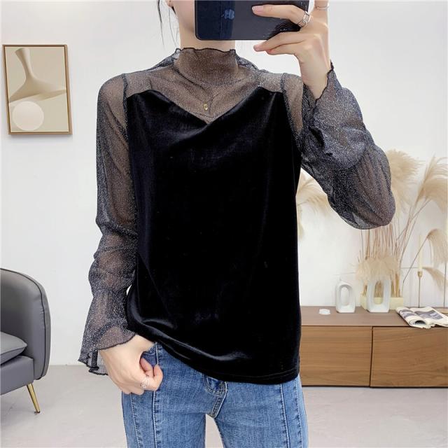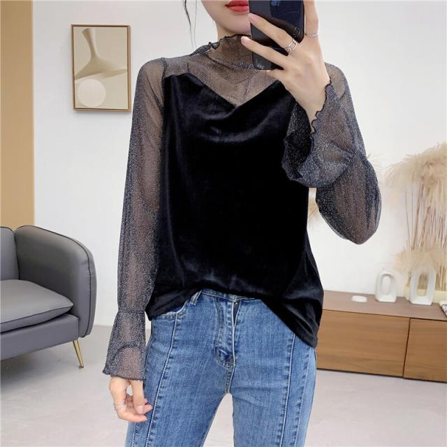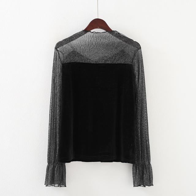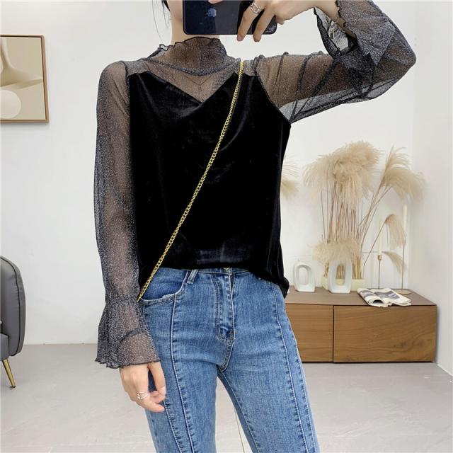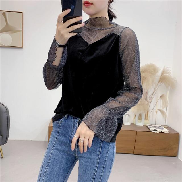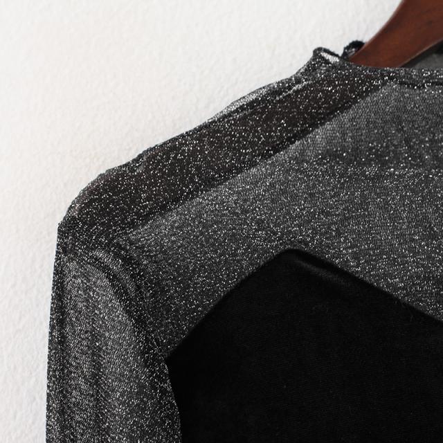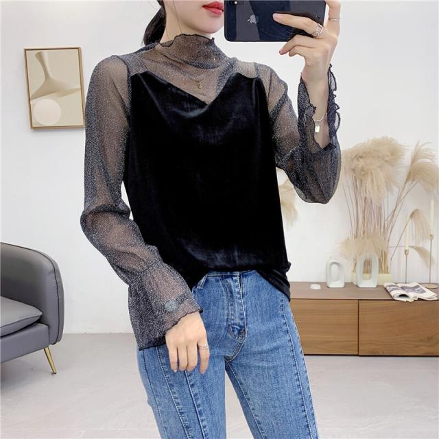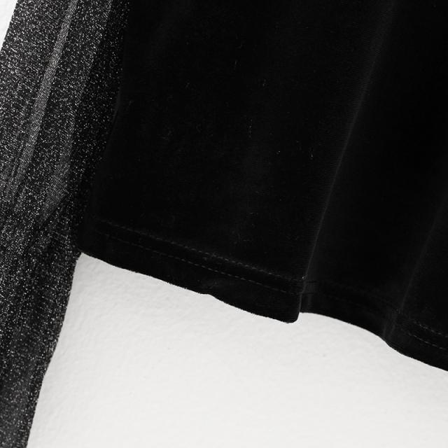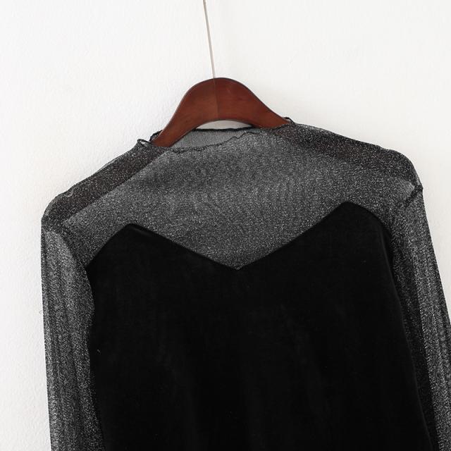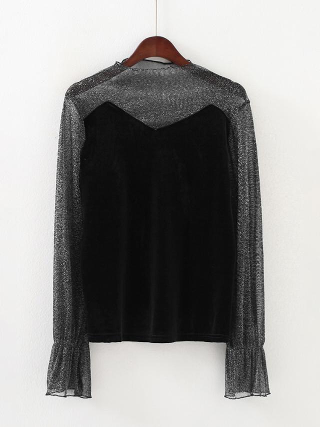 シースルー ラメ入り ドッキング ベロア 異素材 切り替え トップス レディース カットソー 重ね着風 長袖 プチハイネック モックネック 透け感 シアー シンプル カジュアル きれいめ セクシー 大人っぽい 上品 おしゃれ 個性的 クール 春 夏 秋 抜け感 イベント お出かけ 黒