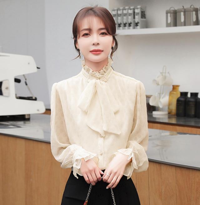 アンティーク風のスタンドカラーフリルにトレンドのボウタイで、存在感のある長袖ブラウス。