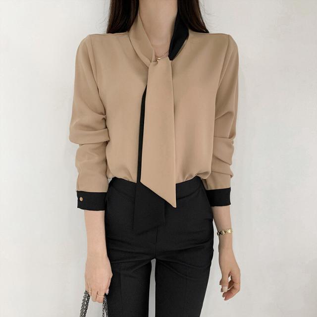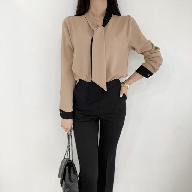 バイカラーブラウス ボウタイ トップス ブラウス 袖あり 長袖 ラウンドネック シフォン かわいい 大人可愛い きれいめ シンプル カジュアル 大人 上品 おしゃれ お洒落 大人可愛い 大人女子 主役級 存在感 とろみ感 無地 春 夏 秋 10代 20代 30代 レディース OL 通勤 学生 通学 デート お出かけ 女子会 休日 着回し 普段使い 重ね着 サイズ S M L XL 色展開 ベージュ