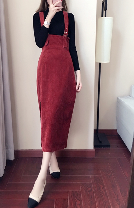 コーデュロイ サスペンダー付き タイト スカート ハイウエスト レディース ボトムス タイトスカート ミモレ丈 ロング丈 すっきり Iライン バッククロス 細畝 綿 ポリエステル シンプル カジュアル 大人 可愛い フェミニン 上品 おしゃれ 脚長効果 普段使い デート 秋冬 赤 茶
