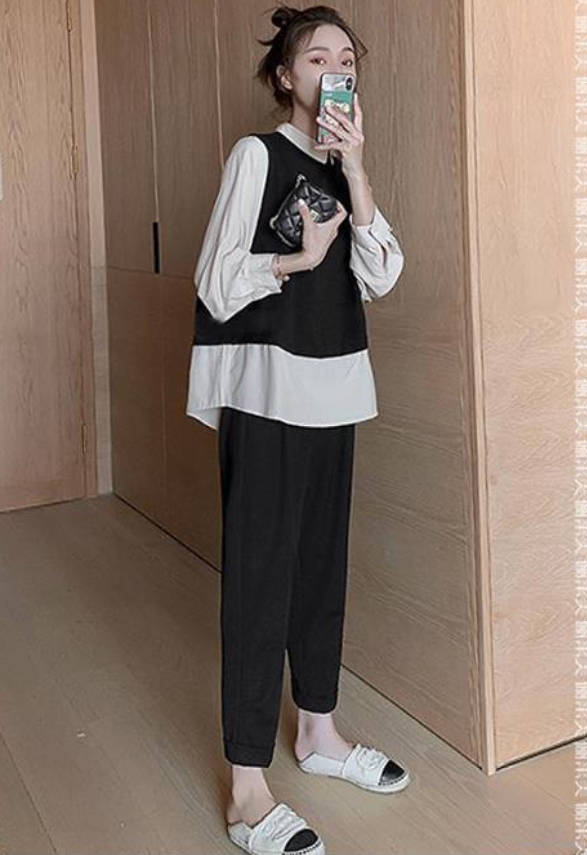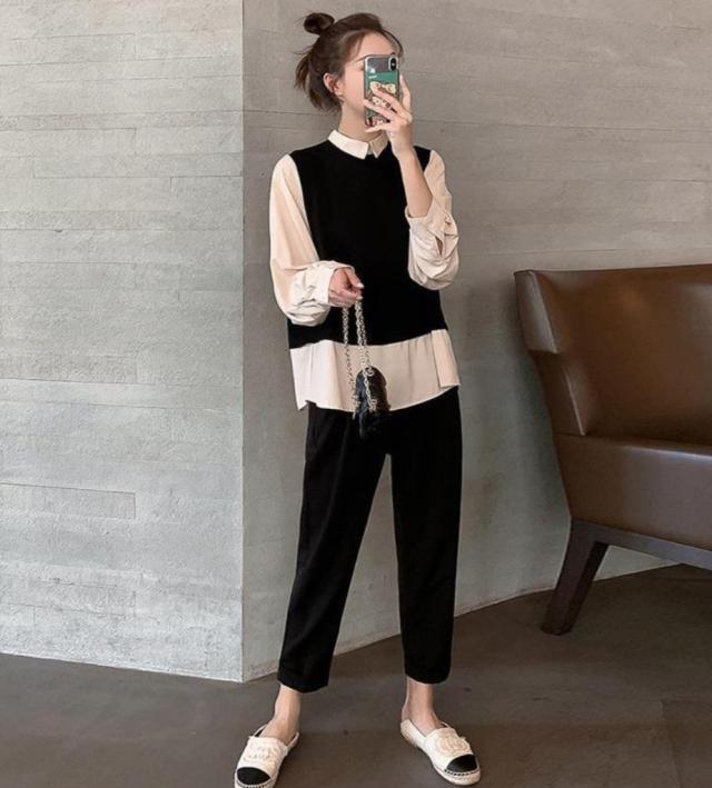 シャツの重ね着風トップスとパンツのお洒落見えなセットアップ♪