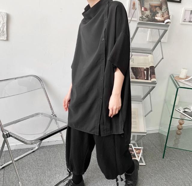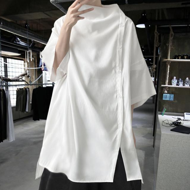 アシメトリー ビッグT トップス Tシャツ カットソー 白シャツ 白トップス ミディアム丈 袖あり 5分袖 五分袖 襟付き スタンドカラー スリット シンプル カジュアル おしゃれ お洒落 かっこいい こなれ感 メンズライク マニッシュ ボーイッシュ ルーズ 個性的 クール モード系 モダン 無地 春 夏 秋 10代 20代 レディース メンズ 男女兼用 通勤 学生 通学 デート お出かけ 休日 旅行 着回し 普段使い 重ね着 韓国 ゆったり サイズ S M L XL 色展開 白 ホワイト 黒 ブラック