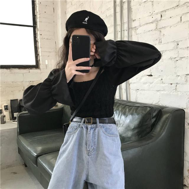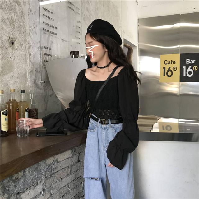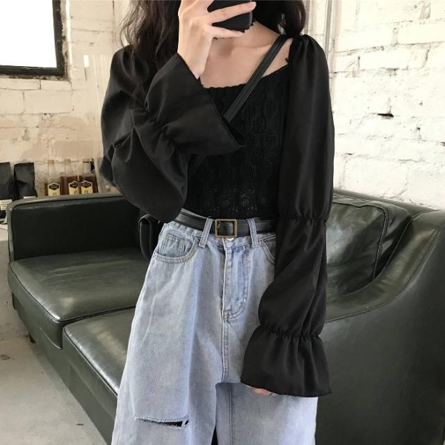 異素材MIX ニット シャツ ブラウス トップス プルオーバー ショート ショート丈 袖あり 長袖 フレアスリーブ スクエアネック 襟なし スリム クロシェ 編み込み かわいい 大人可愛い シンプル カジュアル 大人 おしゃれ お洒落 大人女子 ガーリー 個性的 主役級 無地 春 秋 10代 20代 レディース 通勤 学生 通学 デート お出かけ 女子会 休日 旅行 着回し 普段使い 重ね着 韓国 韓国系 オルチャン フリーサイズ 色展開 黒 ブラック