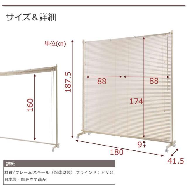 ■商品サイズ/本体:(約)180×奥行7(脚部41.5)×高さ187.5cm、ブラインド:(約)幅176×スラット幅2.5×高さ174cm