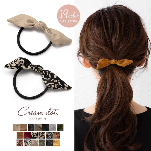 全19色の豊富なバリエーションから選べるねじりリボンヘアゴム。PUレザーやコーデュロイ、デイリーに使える柄を揃えました。リボンを結んだシンプルなデザインだから甘すぎず大人っぽく身に着けられます。