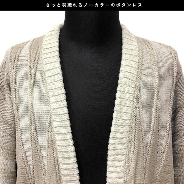 さっと羽織れるノーカラーとボタンレスで軽く着こなしていただけます。