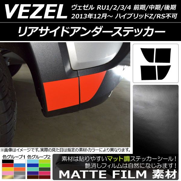 リアサイドアンダーステッカー マット調 ホンダ ヴェゼル RU1/2/3/4 ハイブリッドZ/RS不可 2013年12月〜 色グループ1 入数:1セット(4枚) AP-CFMT3463 色グループ1: ブラック ホワイト レッド ブルー イエロー オレンジ ピンク グレー ゴールド シルバー