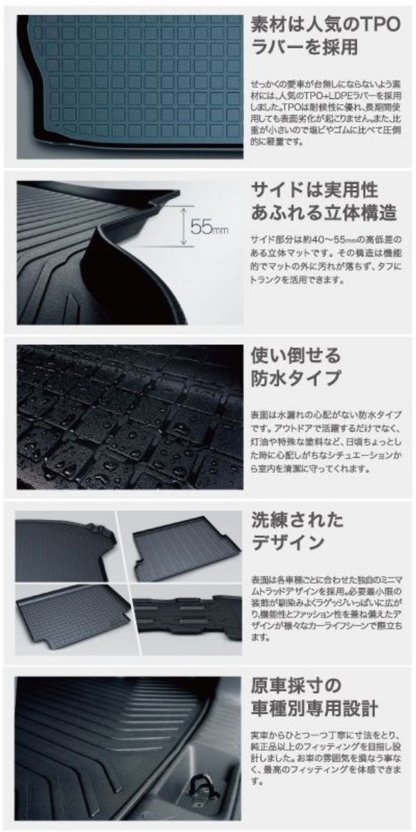 サイド部分は約40〜55mmの高低差のある立体マットです。その構造は機能的でマットの外に汚れが落ちず、タフにトランクを活用できます。