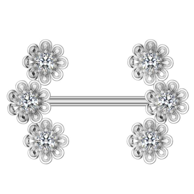 3個の花にクリスタルのキュービックジルコニアをセットした14ゲージのストレートバーベル型の乳首用ボディピアス。