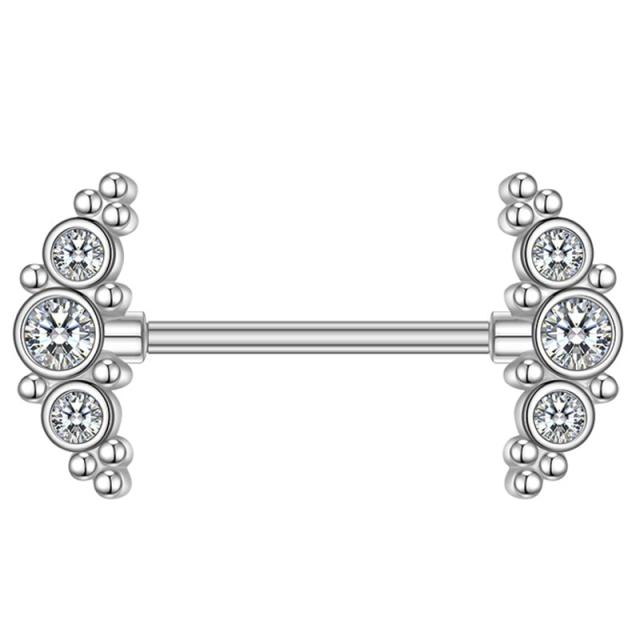 上品でセクシーなモチーフに3個のクリスタルのキュービックジルコニアをセットした14ゲージのストレートバーベル型の乳首用ボディピアス。