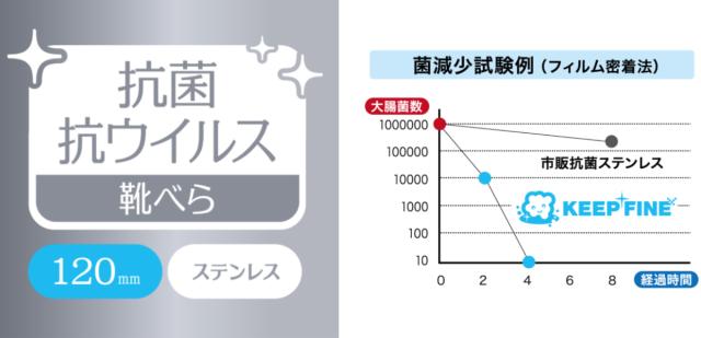 「KEEP FINE」シリーズの靴べらは、抗菌に加えて、抗ウイルス加工が施されています。市販の抗菌ステンレス靴べらと比較して、ウイルス(大腸菌)の数を減少させ、製品を清潔に保つことが実証されています。一般のご家庭だけでなく、公共の場などの不特定多数の人が集まる場所でも安心してお使いいただけます。