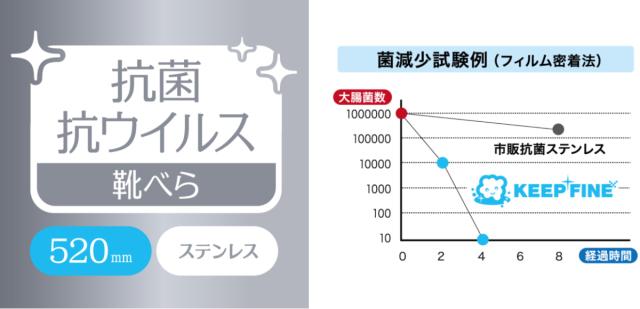 「KEEP FINE」シリーズの靴べらは、抗菌に加えて、抗ウイルス加工が施されています。市販の抗菌ステンレス靴べらと比較して、ウイルス(大腸菌)の数を減少させ、製品を清潔に保つことが実証されています。一般のご家庭だけでなく、公共の場などの不特定多数の人が集まる場所でも安心してお使いいただけます。