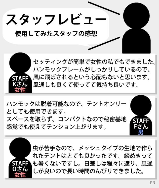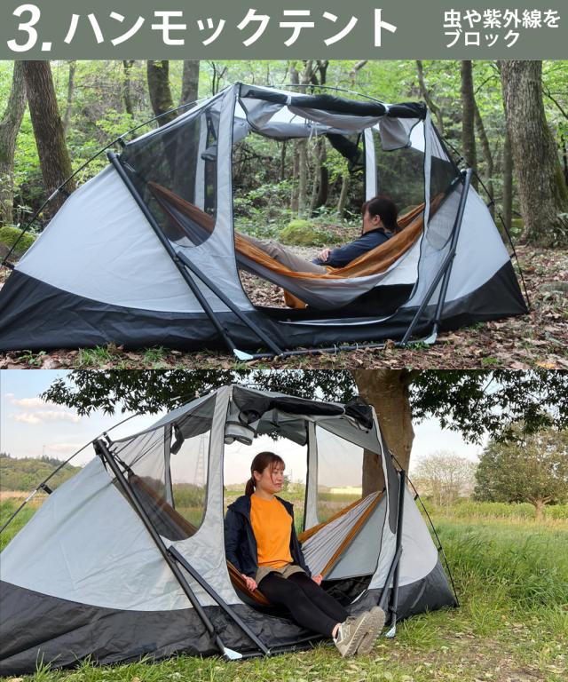 ![]() ![]() ![]() ![]() ![]() ![]() ![]() ![]() ![]() ![]() ![]() ![]() ![]() ![]() ![]() ![]() ![]() ![]() ![]() ![]() ![]() ![]() ![]() ![]() この1台で遊ぶ・座る・泊まるが全て叶う。日本初!スマートで画期的なハンモックテント!!ハンモックでもあり、テントでもある、最新のアウトドアギアです。 インナーテントとフライシートの2重構造になっており、テント単体としてだけではなく、テント内にハンモックを設置することができます。 1台で充実の機能<スマートな4WAY仕様> 1、ハンモック ハンモック布と紐だけで気軽に設置可能 ハンモック生地と紐さえあれば、持ち運びもラクラク♪ 気軽にハンモックを楽しむことができます。 2、自立式ハンモック 吊るす木が無くても好きな場所に設置可能 吊るす木が見当たらなくても大丈夫! すでにフック付のハンモック布をお持ちの方はその日の気分に合わせて布を付け替えることもできます。 3、ハンモックテント ハンモックに揺られながら虫や紫外線をブロック 通気性の良いメッシュ生地とUVカット効果によって虫や紫外線から守られながら、安心して寛ぐことができます。 4,フライシートを被せればテント泊もできます フライシートを被せれば、より一層、プライベート感が強まります。 寝顔を見られる心配がないので、ハンモックに揺られながら安心して熟睡できますよ♪ ■UVカット&耐水圧3000mmの防水加工 紫外線から肌を守るため、UPFは最高値の50+! 防水加工を施しているので、天候が変わりやすい場所で急に雨が降っても安心です。 ■紐とフック付きだから天井に小物を吊るすことも可能 天井には、3本の紐とフックが付いています。 ランタンを吊るしたり、持ち運び扇風機を固定することができるのでテント内がより一層、快適になります。 | ||||||||||||||||||||||||||