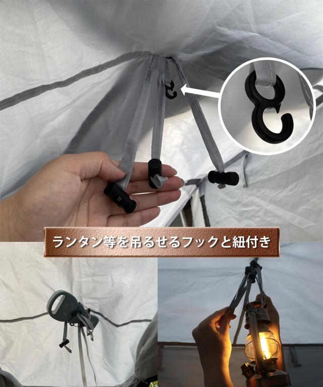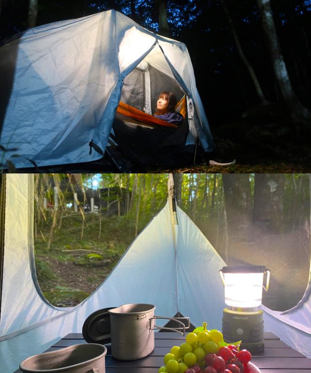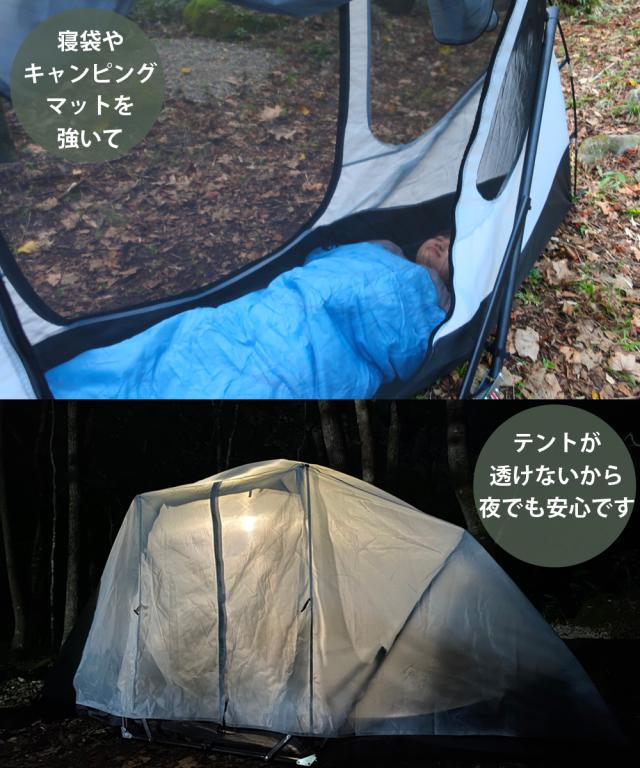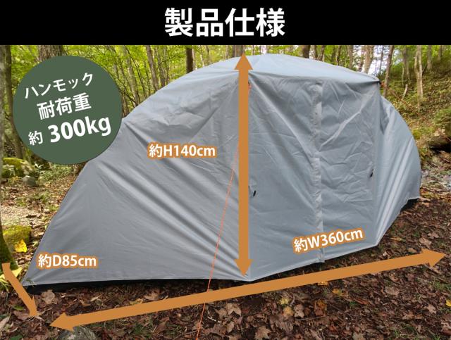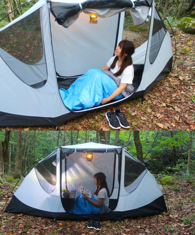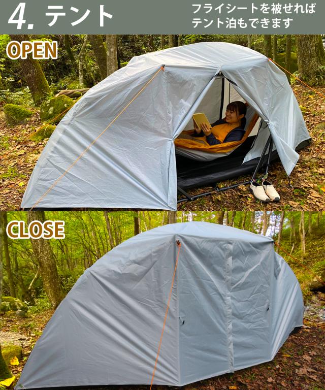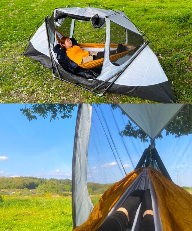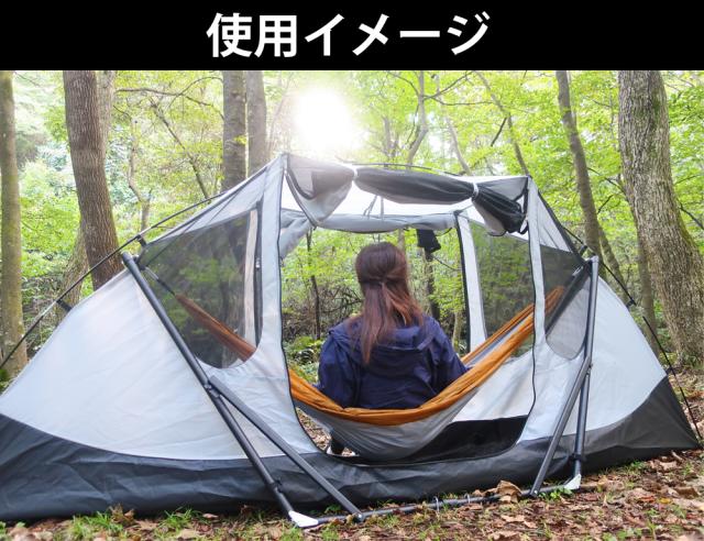 インナーテントとフライシートの2重構造になっており、テント単体としてだけではなく、テント内にハンモックを設置することができます。