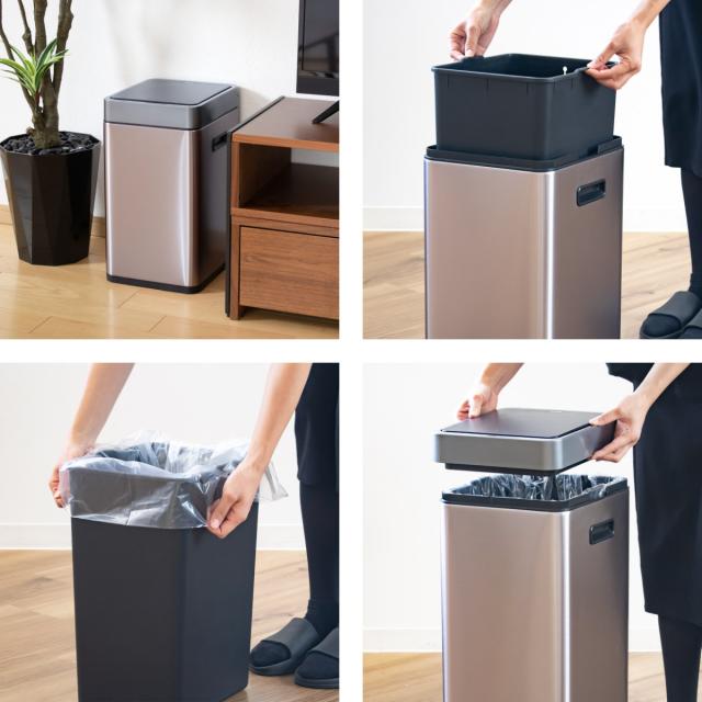インナーボックスを取り出してゴミ袋を掛けるだけでセットが完了します。外から袋が見えないので、生活感を感じさせずインテリアを損ないません。