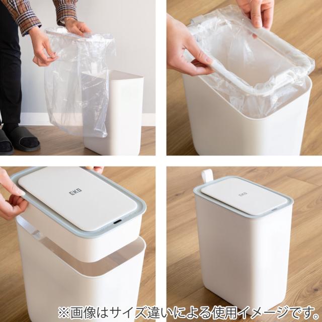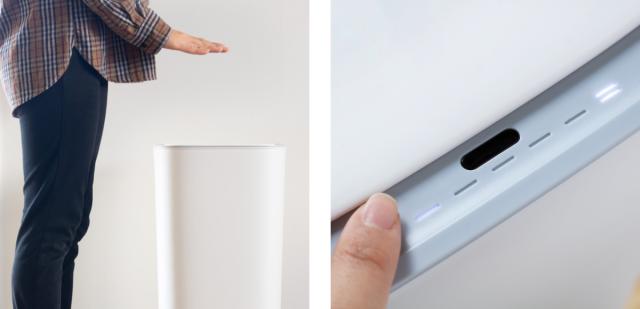 | コードレスな電池式 フタの開閉は電池式のため、コンセントの場所を気にせずどこでも設置できます。※電池は付属しておりませんので、お手持ちの物をご使用下さい。 | シンプルなフォルム 角のないボディーに清潔感のあるカラーはインテリアによく馴染みます。容量は8L、12L、30Lがあり、ホワイト、グレー、ブルーの3色からお選びいただけます。※左から8L、12L、30Lです。 |