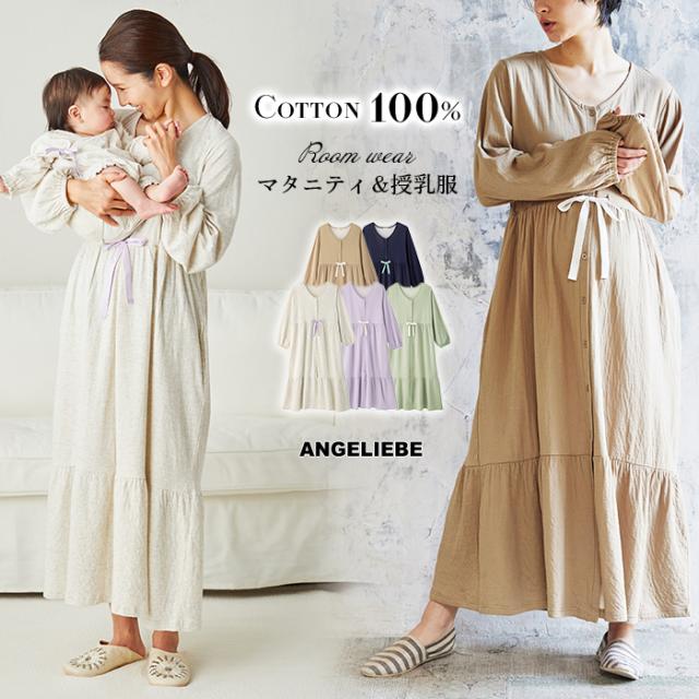 綿100% 授乳服 マタニティ パジャマ 親子ペア 接結 ガーゼ ティアード ネグリジェ 妊婦服 長袖 無地 前開き ワンピース 妊婦 服
