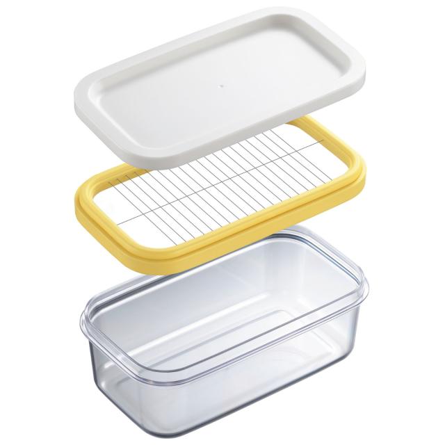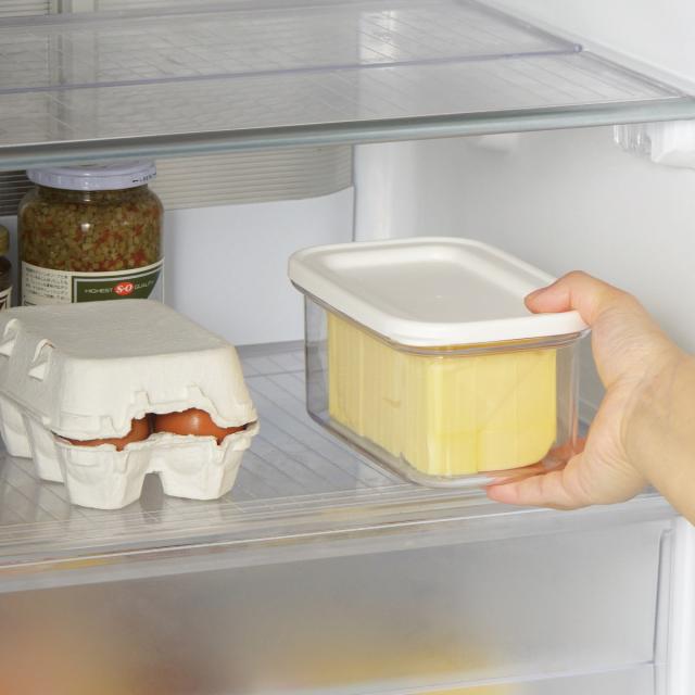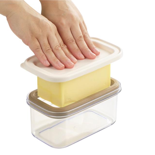 箱やアルミフィルムが傷みやすく、なかなかきれいに使えない市販のバターをカットして保存できるバターケースです。ワイヤープレートにバターを置いてフタでギューっと押すだけなので、手を汚さずにバターをうす切りにカットできます。450gの業務用バターもしっかり入る大容量タイプなので、よくバターを使うご家庭やお菓子作りをするご家庭にピッタリです。
