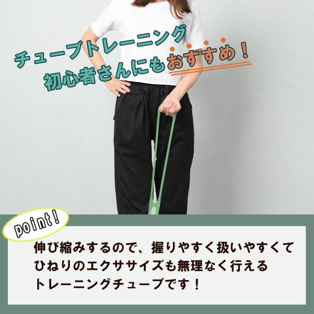 握りやすく扱いやすくて、ねじりやひねりのエクササイズも無理なく行えるトレーニングチューブ、トレーニングの初心者、女性や高齢の方まで無理なくお使いいただけます。