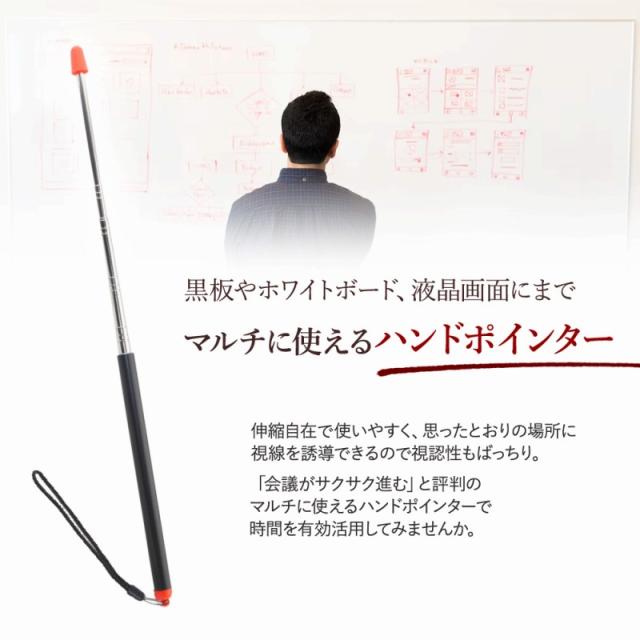 | 商品の説明 | 長いだけでなく、先端が赤くて皆が見やすい、隠れた名品・ポインターです! スクリーンの端までスムーズに指し示し、使わないときは収納してコンパクトに小さくまとめストラップでかけておくこともできます。 伸縮自在で使いやすく、思ったとおりの場所に視線を誘導できるので視認性もばっちり。 「会議がサクサク進む」と評判のマルチに使えるハンドポインターで時間を有効活用してみませんか。 大きなホワイトボードや黒板、パネルを隅々まで指し示せるロングなハンドポインター。 直感的に使えて視認性もばっちり。 プロジェクターやホワイトボードはもちろん実際に現場で指揮するのにも便利な指示棒。 わかりやすく的確な指示とサインが送れるので、あらゆるシーンで大活躍! 持ちやすくてしっかりとしたデザインだからこそお子さまのおもちゃ代わりや幼少期からのディベート能力育成にもお使いいただけます 的確に意見をまとめて相手に伝える際の必需品なのがハンドポインター。 これ1本で議論もスムーズに進むシンプルながらもマルチに使える優秀アイテムです |