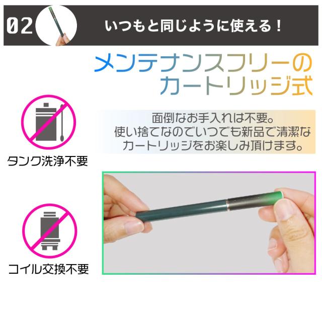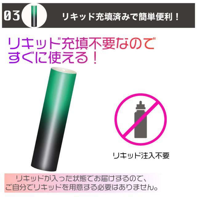 リキッドのメイン成分は天然植物性グリセリン、プロピレングリコール、香料と安全性に最大限配慮しており、当然ながらニコチンやタール等は一切含まれていません。また、本体は耐熱性に優れた食品級の樹脂素材でできており、液漏れを防ぐとともに危険な物質を摂取してしまう心配もありません。