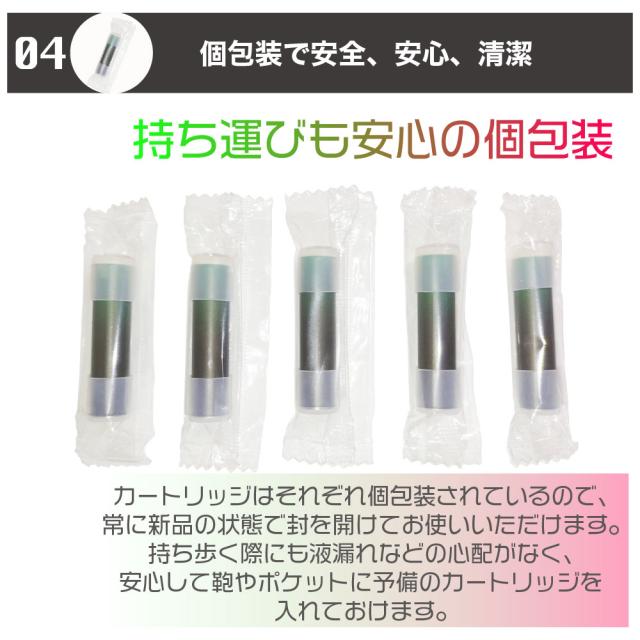 カートリッジ1個あたりの吸引回数は400パフ。清潔な個包装になっているので鞄やポケットに忍ばせておけば外出先で急にカートリッジのリキッドが切れた時などにも対応できます。リキッドは充填済みなので、面倒なリキッド注入等は必要ありません。お手軽に、お得にドクターベイプ を楽しみたい方にピッタリです。