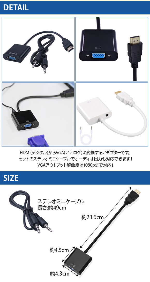 HDMI変換アダプター VGA変換アダプター 変換 ケーブル コネクター コネクタ アダプター アダプタ 端子 HDMI VGA ステレオケーブル オーディオケーブル ステレオ オーディオ プラズマテレビ 液晶テレビ 薄型テレビ テレビ パソコン PC ディスプレイ モニター プロジェクター ゲーム機 DVD HD ハードディスク BD ブルーレイ レコーダー デジタル機器 PC周辺機器 入力 出力 データ 映像 ビデオ AV デジタル アナログ コンバート