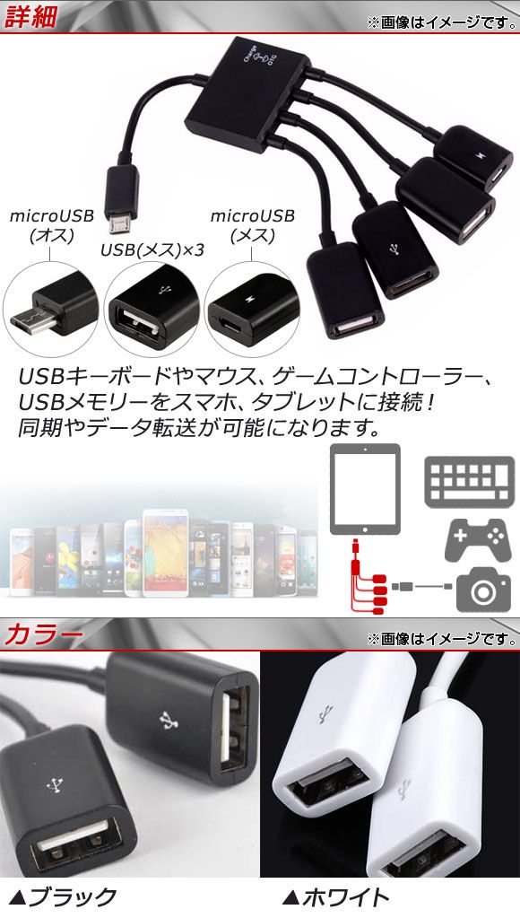 microUSB変換ケーブル 4股タイプ USBハブ機能付き OTG アンドロイド対応 選べる2カラー AP-TH547 カラー: ブラック ホワイト